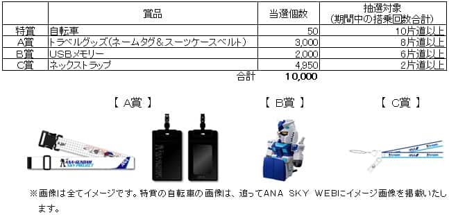 当該キャンペーンでは、期間中のANA国内線の搭乗回数に応じ、“ANAオリジナルのGUNDAMグッズ”が抽選で10,000名様に当たります。いずれの賞品も、「ANA × GUNDAM SKY PROJECT」ならではのオリジナルグッズです。ぜひともこの機会に、ANAをご利用ください。