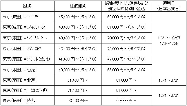 運賃や適用条件は、予告なしに変更される場合があります。また、国際運送約款に準じ、各種航空券には、旅行開始日に設定され、かつ航空券の発行日に有効な運賃が適用されます。一旦航空券をご購入いただいた後、運賃が変更となった場合でも、差額の調整(追徴・払い戻し)は行いません。 |