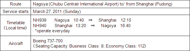 TOKYO December 24, 2010 - ANA, Japan’s leading carrier, today announced that it will resume services from Nagoya to Shanghai when its Summer 2011 timetable begins on March 27 next year. The airline suspended the route on October 31, due to a lack of suitable take-off and landing slots at Shanghai’s Pudong airport. After securing the necessary slots for the Summer timetable ANA has decided to bring the service back into operation. The route will be operated by Boeing 737-700 aircraft, offering a convenient schedule for both business and leisure passengers, departing Nagoya in the morning and returning from Shanghai in the afternoon. Details of the service are as follows (subject to approval by relevant authorities):  * This may differ according to daily aircraft and operating conditions.