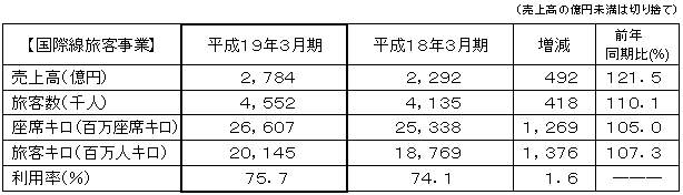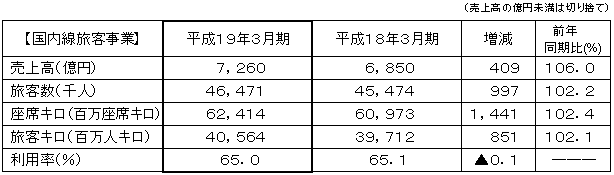 ビジネス需要が引き続き堅調であったことに加え、旅行についても「エコ割運賃」や中国キャンペーンの展開など積極的なプロモーションが奏功し、全体として好調に推移しました。 |