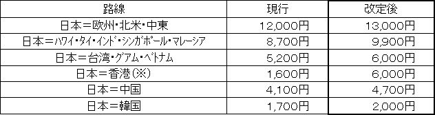 香港線は運航距離に応じ、本来台湾・グアム・ベトナムと同一区分となりますが、現在は関係国政府認可の都合上、そのレベルよりも低額での設定となっています。今回、10月以降分を距離に応じた本来の区分の額で申請を行いましたが、関係国政府の認可次第では最終的に今回の申請額より低額となる可能性もあります。 |