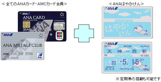 ANAカード・ANAマイレージクラブカードとリンクさせた福岡市地下鉄ICカード乗車券「ANAはやかけん」を発行します。既にANAカード・ANAマイレージクラブカードをお持ちのお客様は現在お持ちのマイレージカードを切替えることなく、「ANAはやかけん」にお申込みいただけます。
