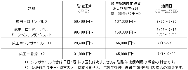 1.「エコ割サマースペシャル」 運賃設定 〜 期間限定で、北米・欧州・アジア・中国の限定路線のエコノミークラスが更におトクに! 〜 |