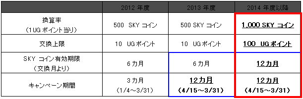 本邦航空会社のマイレージプログラムでは唯一となるANAアップグレードポイント(UGポイント)の利便性を拡充します。 獲得したアップグレードポイント残数(端数)の失効抑止やアップグレード以外への有効利用を目的として、2013年度よりANAアップグレードポイントから「ANA SKY コイン」へ交換キャンペーンを実施いたします。 ANA航空券や旅行商品のお支払いに使える「ANA SKY コイン」への換算率、上限等がアップし、最後の1ポイントまでご利用いただけます。