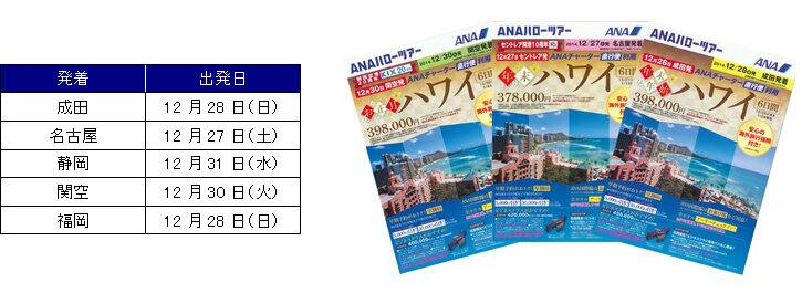 | ANAセールス株式会社(代表取締役社長 白水政治 本社 東京都中央区)は、成田、名古屋、静岡、関空、福岡発着でANAチャーター直行便を利用した、年末年始の「ANAハローツアー ハワイ6日間」を2014年9月10日(水)10時より、順次販売開始いたします。 当ツアーは、ANAチャーター国際線区間で、お客様同志の座席が離れる心配がない「お並び席」や通常ホテルへ15時前後にチェックインのところ、到着後すぐに部屋を利用できる「アーリーチェックイン」をご用意します。 また、出発60日前までの予約で、ビジネスクラスの場合は旅行代金から30,000円引き、エコノミークラスの場合は5,000円引きの早期予約を設定するほか、24時間日本語救急サービス、旅行期間中に海外旅行保険が付いています。 ■ ANAハローツアー 年末年始「ハワイ6日間」 詳細URL www.ana.co.jp/inttour/hallo ![]() ■ 旅行代金一例(大人お一人様/エコノミークラス/2名様1部屋利用) ・ 成田発着 12月28日(日)発 6日間 旅行代金398,000円~618,000円 ・ 名古屋発着 12月27日(土)発 6日間 旅行代金378,000円~638,000円 ・ 関空発着 12月30日(火)発 6日間 旅行代金398,000円~558,000円 |