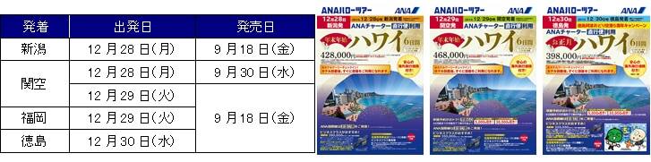 | ANAセールス株式会社(代表取締役社長 白水政治 本社 東京都中央区)は、新潟、関空、福岡、徳島発着でANAチャーター直行便を利用した、年末年始の「ANAハローツアー ハワイ6日間」を2015年9月18日(金)14時より、順次販売開始いたします。 当ツアーは、ANAチャーター国際線区間で、お客様同志の座席が離れる心配がない「お並び席」や通常ホテルへ15時前後にチェックインのところ、到着後すぐに部屋を利用できる「アーリーチェックイン」をご用意します。 また、出発60日前までの予約完了で、ビジネスクラスの場合は旅行代金から30,000円引き、エコノミークラスの場合は5,000円引きの早期予約を設定する(※新潟発は除きます)ほか、24時間日本語救急サービス、旅行期間中に海外旅行保険が付いています。 ■ ANAハローツアー 年末年始「ハワイ6日間」 ■ 詳細URL www.ana.co.jp/inttour/hallo ![]() ■ 旅行代金一例(大人お一人様/エコノミークラス/2名様1部屋利用) ・ 新潟発着 12月28日(月)発 6日間 旅行代金428,000円~678,000円 ・ 関空発着 12月29日(火)発 6日間 旅行代金468,000円~708,000円 ・ 福岡発着 12月29日(火)発 6日間 旅行代金478,000円~708,000円 ・ 徳島発着 12月30日(水)発 6日間 旅行代金398,000円~698,000円 |