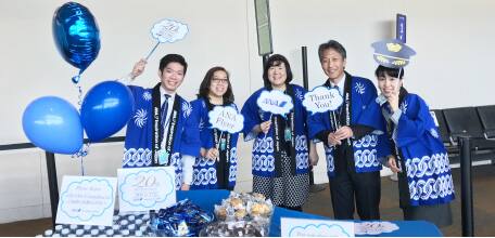 搭乗口ではサンフランシスコ・サンノゼ支店 齊藤 知道支店長、マーティン寿代マネージャーが皆さまへの日頃の感謝をお伝えしました。