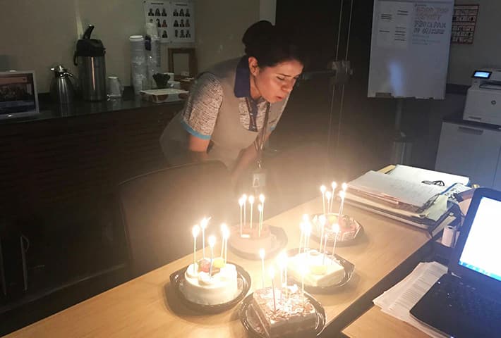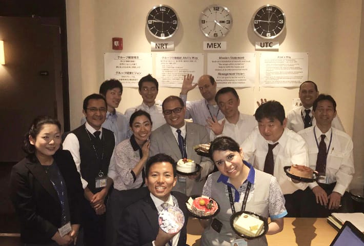 メキシコシティ空港所では、毎月スタッフの誕生日をケーキと一緒にお祝いしています。全員でLas Mañanitasというスペイン語の誕生日の歌を歌い、ろうそくの火を消した後、誕生日のスタッフの顔をケーキに思い切り押し付けます。