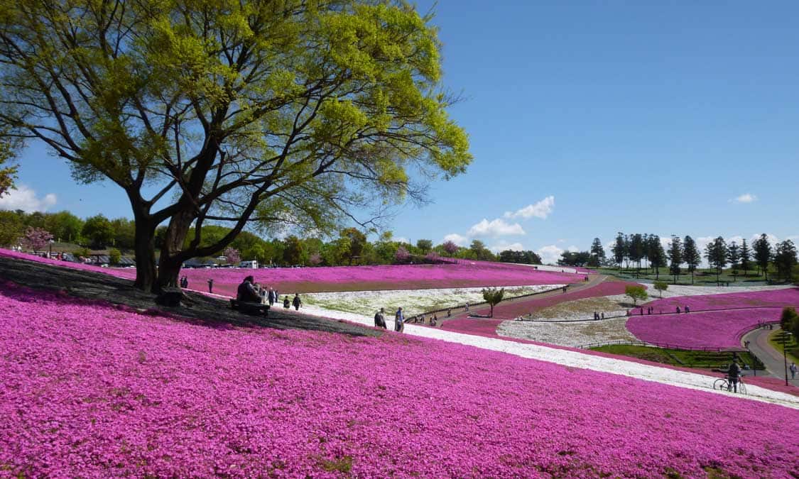 Hachiojiyama Park is a vast park located in Ota City, Gunma Prefecture. Every spring, around 500,000 pink mosses blossom over the entire hill, creating a fantastic view from the walkway on the slope. Strolling along the carpet of bright pink flowers against the vast open sky is sure to be a memorable experience. During the winter, the entire park is lit up and surrounded in breathtaking illumination.