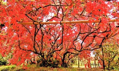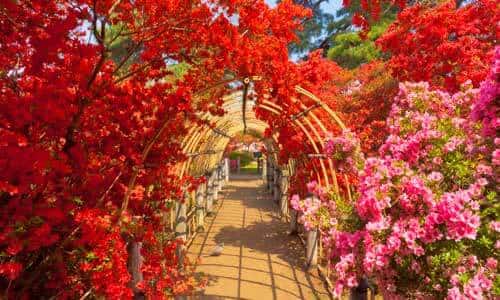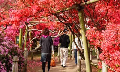 Located in Tatebayashi, Gunma Prefecture, Tsutsujigaoka Park displays around 10,000 azalea trees of over 100 varieties, including an ancient mountain azalea tree that said to be about 800 years old. The Tatebayashi Azalea Festival is held for around a month from mid-April when the azaleas are in full bloom, hosting various fun events for visitors. During this time, crossing boats operate in the Jonuma Pond adjacent to the azaleas, providing a rare view of the bright blossoms from the waters.