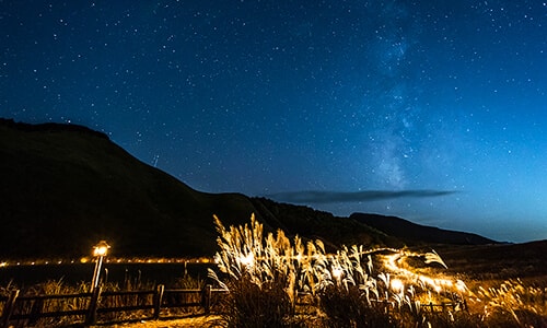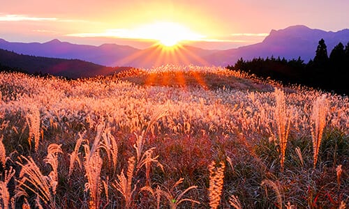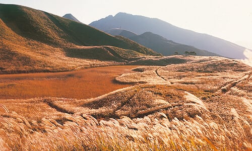 Soni Highland in eastern Nara Prefecture is a vast plain at the foot of Mount Kuruso (elevation: 1,038 meters), one of the 300 Famous Japanese Mountains. Known for the beautiful fields of Japanese pampas grass, every year in mid-March, the wilted grass is burned off the hill, and from spring to summer, fresh pampas grass covers the plain in a green carpet. The scenery becomes even more incredible in the fall season from October to the end of November, as the pampas grass covering the 40-hectare plain turns into stunning waves of silver and gold swaying in the wind.