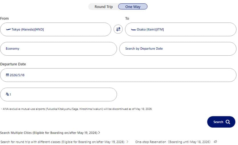 Enter your search criteria and click Search from the top page of the ANA website.