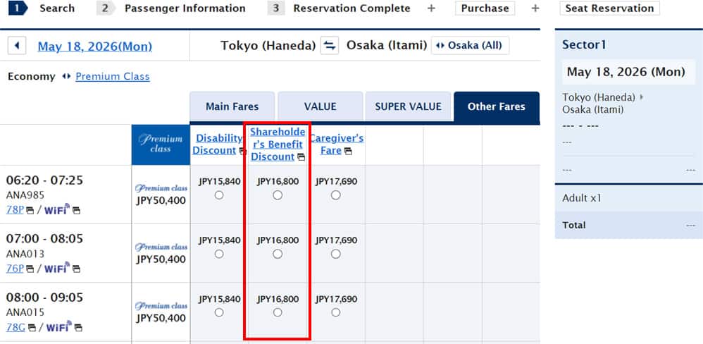 From the domestic flight top page on the ANA Website, enter your search criteria then click Fare type not specified and select Shareholder's Benefit Discount.
