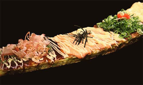 The famous original Nandennen-yaki is made by pouring okonomiyaki batter enough for two in a custom-made long iron frame and grilling it slowly. Four kinds of taste are possible by combining different ingredients and sauces, and all are both beautiful and delicious. While it's very filling, the variety in tastes makes polishing off your plate surprisingly easy.