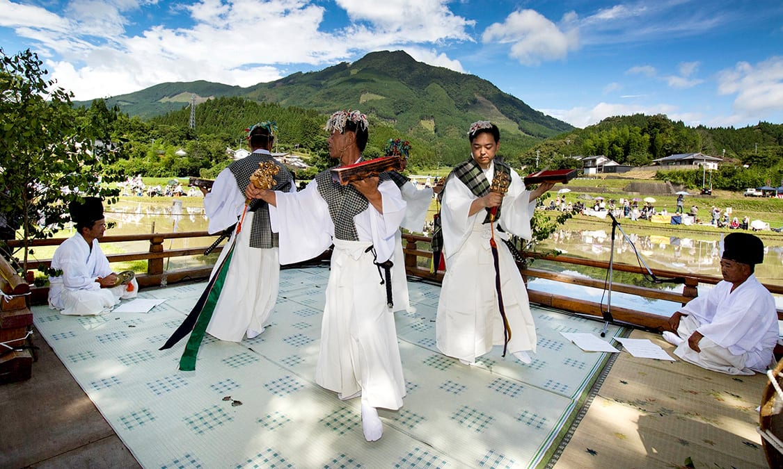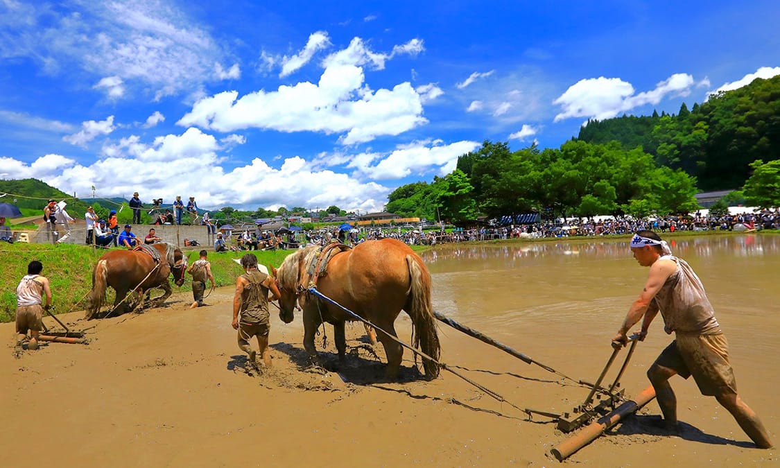 Onda Festival, one of Misato's top three festivals, is held on the first weekend of July every year. Gods and men, cows and horses become one in rice-planting rituals in the shrine's sacred rice field. In the dynamic daikaki ritual, young men plow the field by riding horses and cows through the field, after which the rice is planted, and prayers are offered for an abundant harvest and the health of the worshippers. This festival was designated as an Intangible Cultural Property of Miyazaki in 1988.