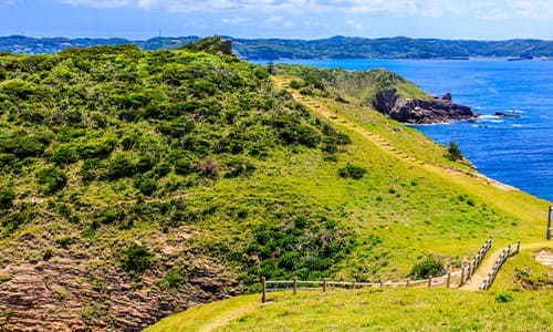 Located about 10 minutes by boat from Katsumoto Port at the northernmost tip of Iki Island, the entirety of the uninhabited island is designated as a national natural monument. From March to November, visitors can take a ferry to Tatsunoshima and enjoy swimming on the beautiful beach in the summer. The bow-shaped shore is stunning with a white sandy beach and crystal clear waters that will leave you amazed. The shallow beach is perfect for families to frolic in the sea. Sail around the island on a cruise tour to discover its breathtaking natural scenery, created by the vivid contrast of the ocean and land.