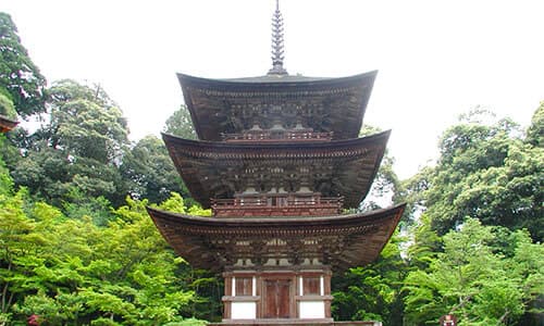 Saimyo-ji Temple boasts an extensive collection of important properties, including such national treasures as the Main Hall and Three-Story Pagoda as well as important cultural properties such as the impressive statues of the Two Guardians and Twelve Heavenly Generals. Although it is believed to have been built in 834, a major revision in this dating may be needed to many years earlier, as a Buddhist drawing considered to be one of the oldest in Japan was discovered on a pillar in the Main Hall in a recent research activity. In the fall, a spectacular range of colored leaves will welcome you as you stroll along the approach via stone steps toward the Main Hall. The temple's Hombo Garden, known as Horaitei, is a further treasure and is designated as a place of National Scenic Beauty.