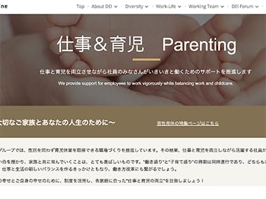 育児や介護との両立をはじめ、社員の充実した生活を支えるための制度整備を進めています。また、本人だけでなく上司や職場の理解促進を図ることで男性の育児休業・休暇の取得率も向上しています。これまで一部の会社のみだった3日間の育児休暇をグループ全体に展開し、男性の育児参画を促進することにより、社員や家族の生活・人生の充実のサポートに取り組んでいます。