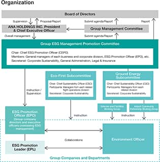 The ANA Group established the Group ESG Management Promotion Committee in accordance with Group ESG Management Promotion Committee Regulations. This committee, which operates under the guidance of the president and under the chairmanship of the director in charge of corporate sustainability (CEPO: Chief ESG Promotion Officer), consists of ANA HOLDINGS INC. and group company directors, executive officers, and the full-time Audit & Supervisory Board members of ANA HOLDINGS INC. The committee discusses core policies and measures related to ESG management, including risk management and compliance and progress against targets is monitored four times a year.