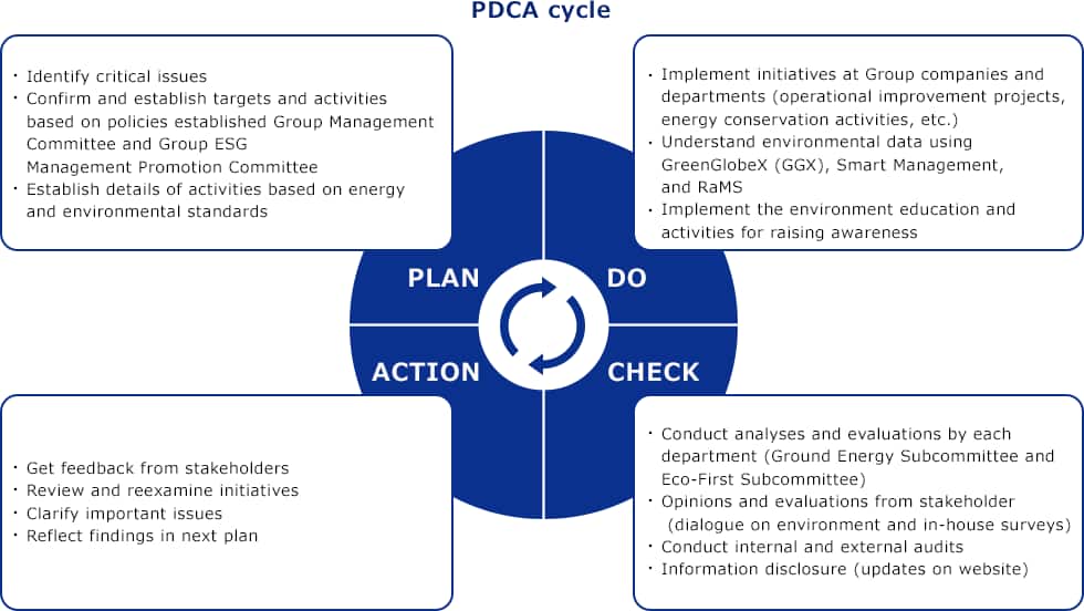 Based on the above promotion and risk management systems, the ANA Group has created its own "Energy Management Standard" and established an environmental management system in accordance with ISO 14001, the Energy Conservation Law, the CFC Emission Control Law, and the Plastic Recycling Promotion Law to be enforced from April 2022. This management standard is programmed for efficiency improvement management, including planning (goal setting), data management, evaluation, improvement, and action in "energy," "water," "waste," and "CFCs.To manage progress, we use the energy data management system "GreenGlobeX (GGX)," the industrial waste management system "Smart Management," and the CFC management system "RaMS," and provide management education to Group companies every year.Through appropriate energy, water, and waste management, we ensure that equipment and facilities are inspected, maintained, and disposed of properly.