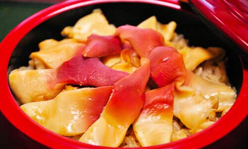 ほっきめしとは、冬の貝の王様と呼ばれるほっき貝をふんだんに使った、宮城県南部の海沿いの地区に古くから伝わる郷土料理です。12~5月の旬に水揚げされた生のほっき貝を醤油ベースのタレで煮込み、その煮汁で炊き込んだご飯の上に鮮やかな赤色に染まった身を載せていただきます。コリコリとした歯ごたえのほっき貝と、貝の旨味がしみこんだご飯の相性は抜群で、やみつきになる味わいです。