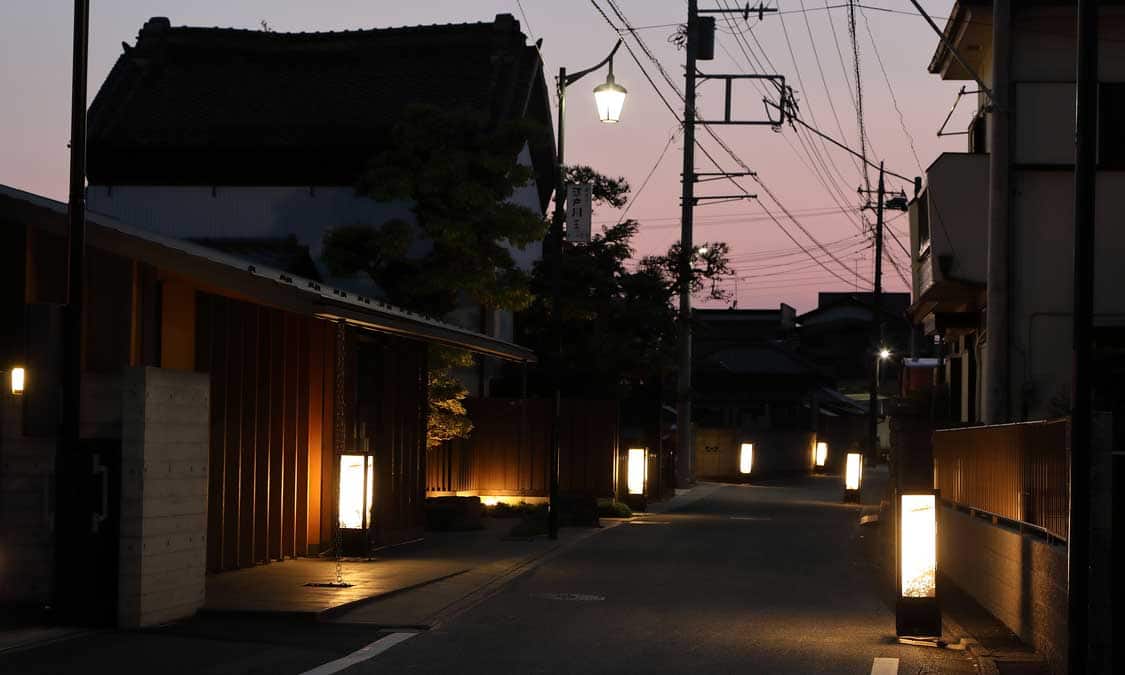 夕刻になると、軒下や路地を手作りの切り絵行灯の優しい灯りが彩ります。住民たちがボランティアで作りはじめたもので、現在100基を超える行灯一基一基の切り絵には、そこに暮らす住民の想いやその家の歴史が表現されています。行灯が燈る流山本町の町並みは「行灯回廊」や「江戸回廊」とも呼ばれ、夜の散策を楽しませてくれます。