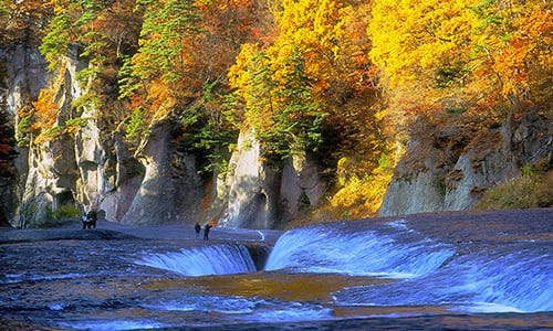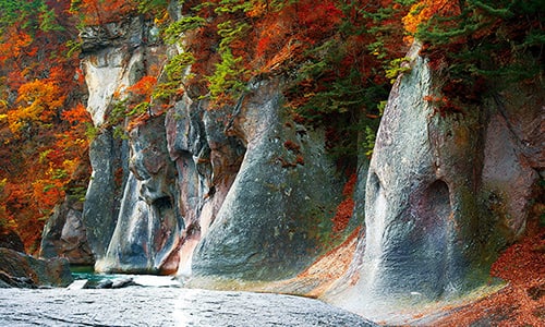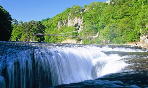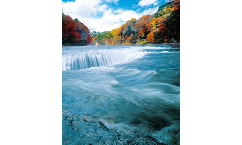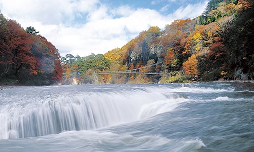 吹割の滝は高さ7メートル、幅30メートルもの大きさ。急流が川底の割れ目に向かって、左右から豪快に流れ落ちる様子は圧巻です。整備された遊歩道を進むと上流から滝を臨むことができます。じっと見つめていると、まるで滝つぼに吸い込まれて行くような不思議な感覚に包まれます。ゆっくり歩いて1時間程度。滝の音を聞きながら森林浴を楽しみましょう。