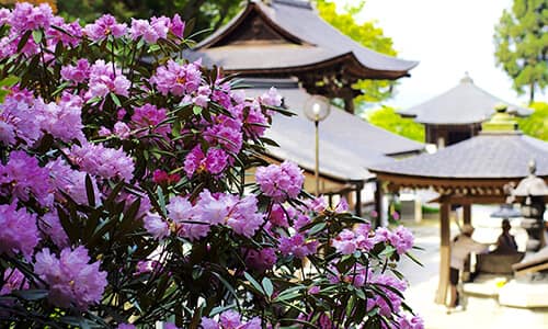岡寺の別名は「花の寺」。毎年4月中旬から5月上旬にかけて、約3,000株ものシャクナゲが鮮やかなピンク色の美しい花を咲かせます。奥の院参道、仁王門周辺、本堂へと続く階段、本堂周辺など、シャクナゲが見事に咲き誇る様子はまさに圧巻です。また、ゴールデンウイーク期間には、仁王門を入ってすぐの池や手水舎、鉢にダリアを浮かべて参拝客を迎えるイベントも開催。まさに花の寺です。