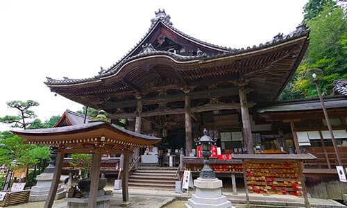 岡寺の仁王門をくぐり長い石段を上ると本堂のある境内です。ご本尊は如意輪観音(にょいりんかんのん)座像です。塑像(土でできた仏像)としては日本最大の仏様で、高さは4.85メートル。その大きさには驚かされます。東大寺の大仏像や長谷寺の観音像と並んで日本三大仏とされてきました。古来より現在に至るまで永きにわたって「やくよけの観音様」として信仰を集めている観音様です。