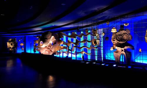 大阪万博のシンボルゾーンに、芸術家・岡本太郎により造られた太陽の塔。塔の頂部には金色に輝き未来を象徴する「黄金の顔」、現在を象徴する正面の「太陽の顔」、過去を象徴する背面の「黒い太陽」という3つの顔を持っています。内部は博覧会当時は展示空間でしたが、博覧会閉幕後、約50年近く公開してきませんでした。2018年3月に内部再生を果たし、当時、展示されていた「生命の樹」や第4の顔である「地底の太陽」を復元し、幻想的な空間が一般公開されています。(入館は太陽の塔オフィシャルサイトより予約優先)
