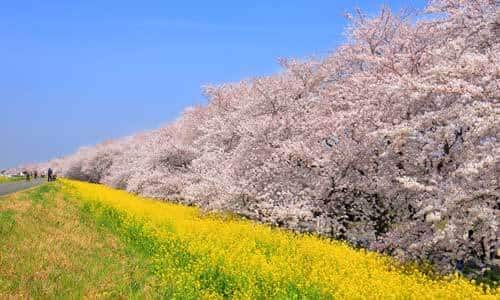 熊谷駅から徒歩5分、400年も前から桜の名所として知られ、日本さくら名所100選にも選ばれています。荒川の土手沿いに約500本のソメイヨシノが約2キロメートルにわたり咲き誇り、その傍らには黄色い菜の花が一緒に咲き連なります。その生命力にあふれる春の花景色は、息をのむ美しさです。(菜の花の開花状況が年により芳しくない場合もあります)