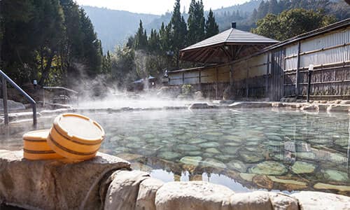 渡瀬温泉は、川湯と湯の峰の中間、熊野の山のふところの四村川(よむらがわ)沿いにあります。バンガローやキャンプ場もあり、釣りや川遊びなどアウトドアアクティビティも楽しめます。肌がなめらかになる「美人の湯」としても有名で、日帰りでも利用できる西日本最大級の源泉かけ流し大露天風呂や、ゆったりとした家族専用の貸切露天風呂などがあります。健康促進を目的としたさまざまな浴槽やトレーニングルームなどがあるクアハウスが大人気です。
