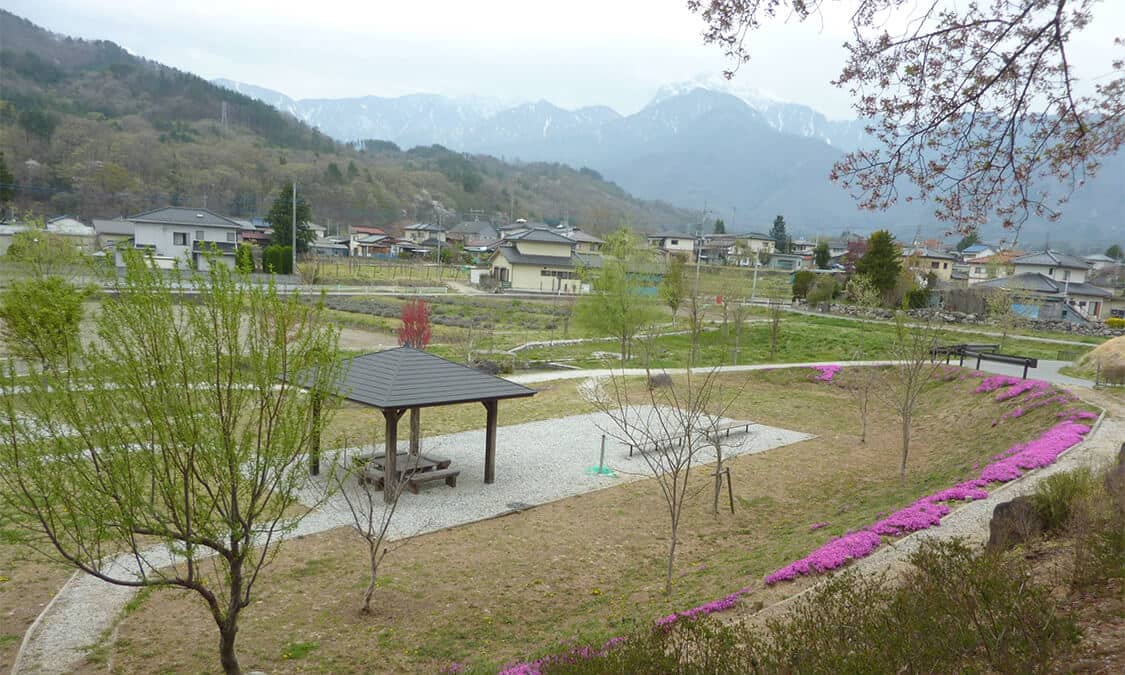 台ヶ原宿から徒歩5分のところにあるほたる親水公園。テラスからは日本百名山の甲斐駒ヶ岳や南アルプスの山々を眺めることができます。春の桜、初夏のほたる、秋の紅葉と四季折々の楽しみがあります。