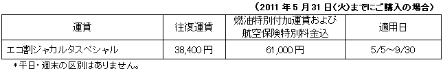 1.販売期間 : 2011年4月27日(水)〜2011年5月31日(火) 2.設定期間 : 2011年5月5日(木)〜2011年9月30日(金) (日本出発分) ■東京(成田)発ジャカルタ行き「エコ割ジャカルタスペシャル」運賃