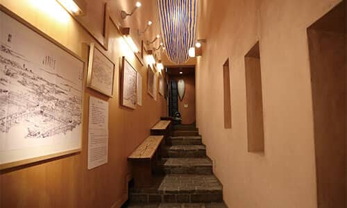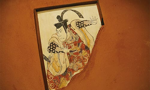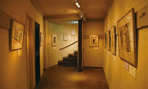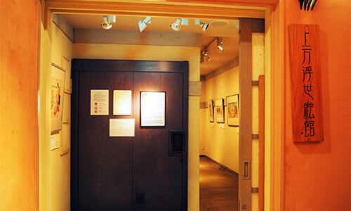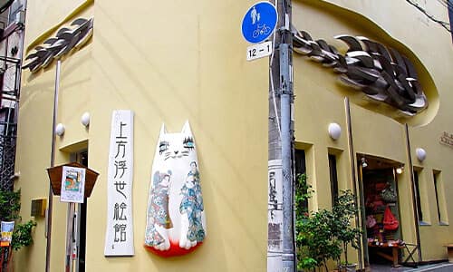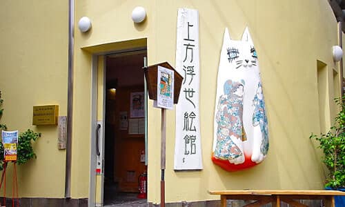在奶油色的墙壁上,向上看是以稻谷为灵感的银色造型艺术品,在道路的转角处则是巨大的猫招牌。从建筑和招牌林立的热闹的道顿堀向南,上方浮世绘馆就位于以水挂不动为闻名的法善寺的门前。从面向猫招牌左手边的小门进去,里面别有一番洞天。您不妨暂时忘却南区的喧嚣,在安静的空间欣赏上方浮世绘之美。
