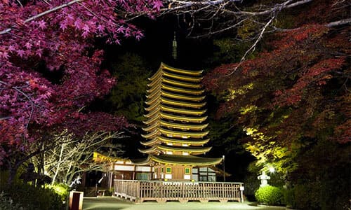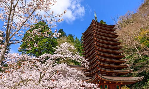 談山神社佇立於奈良縣櫻井市多武峰的山中,歷史相當悠久。寺院裡祭祀著推動大化革新的藤原鎌足,而這場改革運動是所有日本史教科書上必定記載的日本古代史重大事件。藤原鎌足在西元 645 年登上多武峰,與中大兄皇子密談國家革新計畫,這座山因此被稱為「談山」,也正是此神社名稱的由來。這裡也以賞櫻和賞楓名勝聞名,秋天時有 3,000 棵楓樹圍繞。初夏的新綠亦是美景,在這裡能欣賞四季迥異的美好景色。