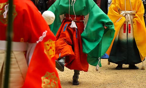 蹴鞠是約 1,400 年前從中國傳來的一種遊戲方式,以 8 人為一組用腳不斷踢球,目標是不能讓球落地。據傳談山神社所祭祀的藤原鎌足初次與中大兄皇子見面的地點就在飛鳥(現在的奈良)法興寺舉辦的蹴鞠會上,今日的蹴鞠祭便是基於此傳聞,以春、秋一年兩次的頻率舉辦。蹴鞠祭是相當雅致的祭典,參與人員穿著當時的傳統裝束,並依照一定的舉止與方式進行活動。