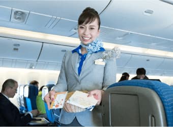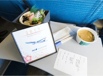 機内では、愛媛県が育成した新品種の生花「さくらひめ」をコサージュとして着用した客室乗務員がおもてなし。機内食として、おせちとドリンクをご用意しました。しかし皆様、お食事を召し上がりながらも、飛行機の窓から見えるであろう初日の出を、今か今かとそわそわ…。