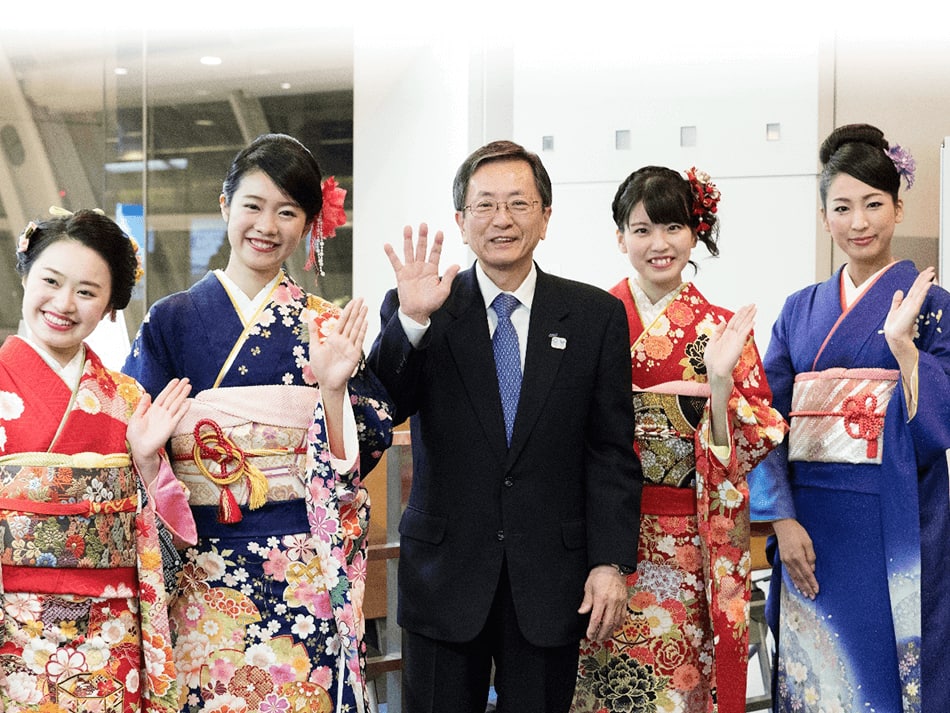寒い中早朝から来てくださったご搭乗の皆様にANAオリジナルグッズをお渡ししました。着物姿の係員と記念撮影を行い、いざ機内へ!