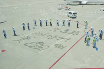 ANAグループ社員よるモップアートのお見送りの中、初便のANA725便は11時45分に宮古空港へ向けて出発!
