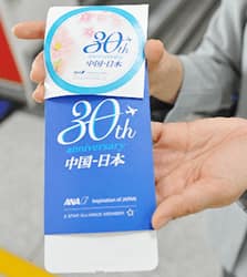 北京空港では、搭乗手続きの際、30周年就航記念特製搭乗券ホルダーと、日中友好の印として、それぞれの国の象徴花である桜と牡丹を描いたシールをお客様にお渡し。