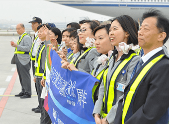 ドアが閉まると、スタッフ全員で北京線就航30周年の横断幕を持ち、お客様をお見送り。機内から手を振りかえして下さる姿に社員一同、感謝の気持ちと笑顔でいっぱい。
