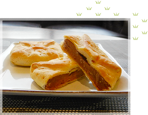 「武者がえし」とは熊本城の石垣のことで、武士や忍者でも登れないような造りになっています。そんな石垣を銘としたこのお菓子は和の餡と洋のパイを融合させています。サクッと軽いパイとまろやかでキレのよい甘みの餡がほどよくマッチしています。