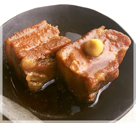 与那覇前浜ビーチ近くで農家民宿津嘉山荘を営む名物女将「津嘉山千代さん」が丹精込めて作った、沖縄県の郷土料理ラフテー。分厚い三枚肉を泡盛と黒糖でじっくり煮込んでおり、箸で切れるくらい軟らかくなっています。農林水産大臣賞をもらっているこの味をぜひご堪能下さい。