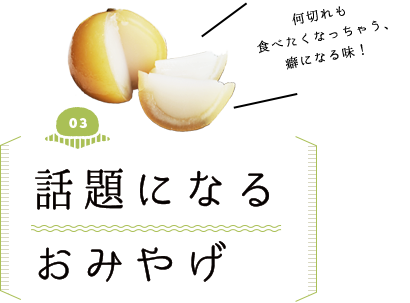 宮崎特産の日向夏の姿をそのまま生かしたようかん。 周りの皮は、本物の日向夏の皮を蜜漬けしたものを使用しており、 柔らかいようかんとシャキッとした皮の食感がマッチしています。 皮のほのかな苦味とようかんのほどよい甘さで、 さっぱりとした味に仕上がっています。