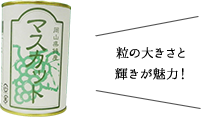 岡山特産「マスカット・オブ・アレキサンドリア」のさわやかな味と食べごたえを楽しめる逸品。一つ一つ丹精込めて作られたマスカットを手作業で皮をむき、自然の味をこわさないやさしい味のシロップに漬け込んで、果物本来の風味を生かしています。