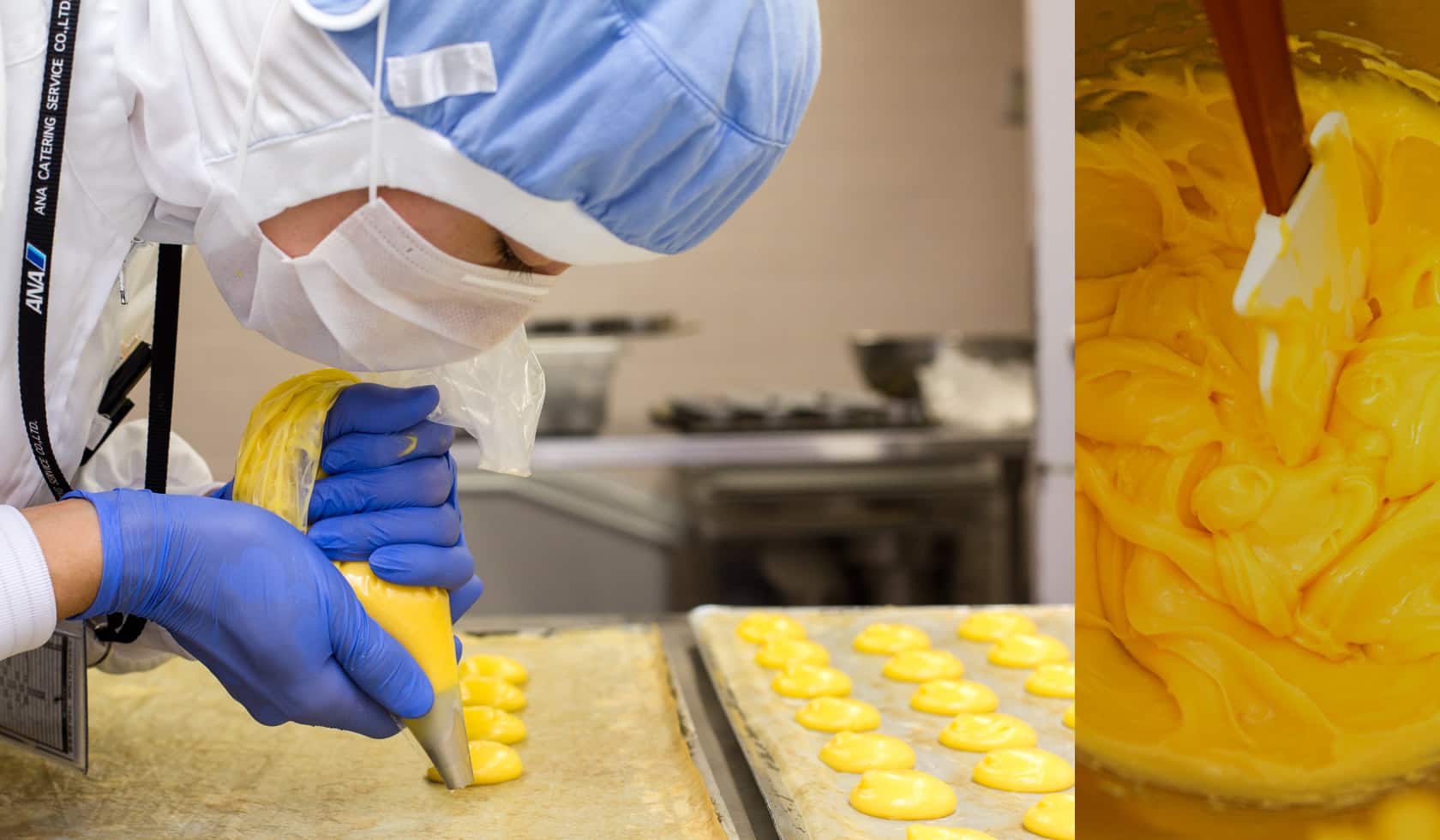 イメージを覆した“手作り”だらけの機内食作り ぐつぐつと鍋のなかで煮立っているのは、牛乳と水、グラニュー糖に塩をひとつまみ入れたもの。そこに薄力粉を入れ、卵黄と合わせて丹念にこねる。絞り器に移し、ベーキングシートを敷いた大ぶりのトレーにテンポ良く絞り出したら、自家製のクッキー生地を上に載せて巨大なガスオーブンに入れ、175℃で30〜40分。こんがりと芳醇な香りが漂ってきたら、シュークリームの生地の完成だ。これはANAのスペシャリテになる。国際線ビジネスクラスの人気デザートなのだとか。「原料から自社で手作りするのですが、日に400個くらい作ります。全部サイズを合わせなくてはいけないため、絶妙な力加減と勘だけが頼りです」機内食のペストリー部門、すなわちデザートを手がける森 優希は、この道6年。だがもともと「機内食に関わりたい」と考えていたわけではなかったようだ。入社したキッカケは「私の親が料理上手だったので、自分もそうなりたくて洋食の調理を勉強しました。調理専門学校に通っていたときに、機内食の求人を目にしたのがキッカケでしたが、デザートは配属先だったからというのが理由です」それまで機内食には“お弁当”のようなイメージしか持ち合わせていなかったという森。だが先述のような工程と手作りへのこだわりに驚いたという。