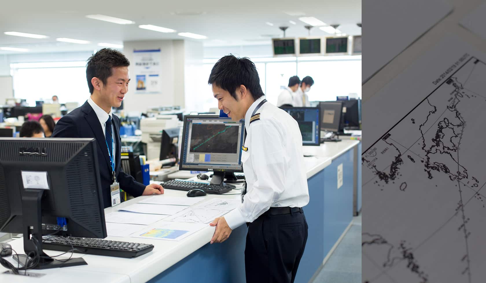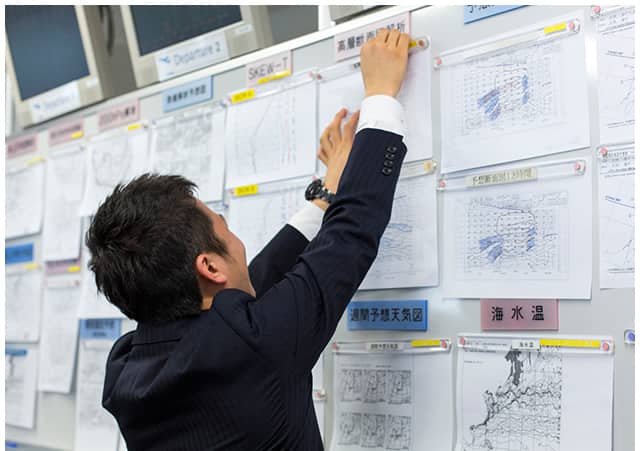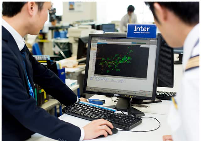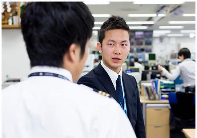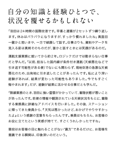 自分の知識と経験ひとつで、状況を覆せるかもしれない 「羽田は24時間の国際空港です。早番と遅番が2セットずつ繰り返します。休みはバラバラになりますが、すっかり慣れましたね」真面目一徹かと思いきや、一方で破顔して話す。仕事ぶりも、資料やデータを見入る姿は真剣そのものだが、誰かと話すときには笑顔があるのだ。運航支援業務に就いてから約2年。ロジックだけでは勤まらない仕事だと学んだ。「以前、担当した国内線が条件付き運航(天候悪化などで引き返す可能性がある便)でないにも関わらず、現地空港の急激な天候悪化のため、出発地に引き返したことがあったんです。私により深い経験があれば、結果が変わった可能性もありました。今でもすごく悔やまれます」だが、経験が結果に活かせる仕事だとも学んだ。「無線業務のとき、羽田に強い雷雲がかかっていて、着陸状態が悪いことがあったんです。前便の情報や観測されている天候状況をもとに、着陸する乗務員に詳細なアドバイスを行いました。その後、ステーションに帰ってきた乗員から、『天気は悪かったけど、おかげでやりやすかったよ』という感謝の言葉をもらったんです。乗員はもちろん、お客様のお役に立てたという実感が持てて、すごくうれしかったですね」普段はお客様の目に触れることがない“裏方”であるだけに、お客様を意識できる瞬間は、印象深いのだという。