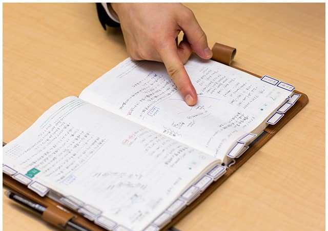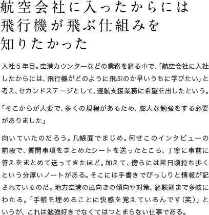 航空会社に入ったからには飛行機が飛ぶ仕組みを知りたかった 入社5年目。空港カウンターなどの業務を経る中で、「航空会社に入社したからには、飛行機がどのように飛ぶのか早いうちに学びたい」と考え、セカンドステージとして、運航支援業務に希望を出したという。「そこからが大変で、多くの規程があるため、膨大な勉強をする必要がありました」向いていたのだろう。几帳面でまじめ。何せこのインタビューの前段で、質問事項をまとめたシートを送ったところ、丁寧に事前に答えをまとめて送ってきたほど。加えて、傍らには常日頃持ち歩くという分厚いノートがある。そこには手書きでびっしりと情報が記されているのだ。地方空港の風向きの傾向や対策、経験則まで多岐にわたる。「手帳を埋めることに快感を覚えているんです(笑)」というが、これは勉強好きでなくてはつとまらない仕事である。