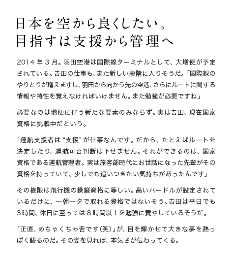 日本を空から良くしたい。目指すは支援から管理へ 2014年3月。羽田空港は国際線ターミナルとして、大増便が予定されている。吉田の仕事も、また新しい段階に入りそうだ。「国際線のやりとりが増えますし、羽田から向かう先の空港、さらにルートに関する情報や特性を覚えなければいけません。また勉強が必要ですね」必要なのは増便に伴う新たな要素のみならず。実は吉田、現在国家資格に挑戦中だという。「運航支援者は“支援”が仕事なんです。だから、たとえばルートを決定したり、運航可否判断は下せません。それができるのは、国家資格である運航管理者。実は旅客部時代にお世話になった先輩がその資格を持っていて、少しでも追いつきたい気持ちがあったんです」その権限は飛行機の操縦資格に等しい。高いハードルが設定されているだけに、一朝一夕で取れる資格ではないそう。吉田は平日でも3時間、休日に至っては8時間以上を勉強に費やしているそうだ。「正直、めちゃくちゃ苦です(笑)」が、目を輝かせて大きな夢を熱っぽく語るのだ。その姿を見れば、本気さが伝わってくる。
